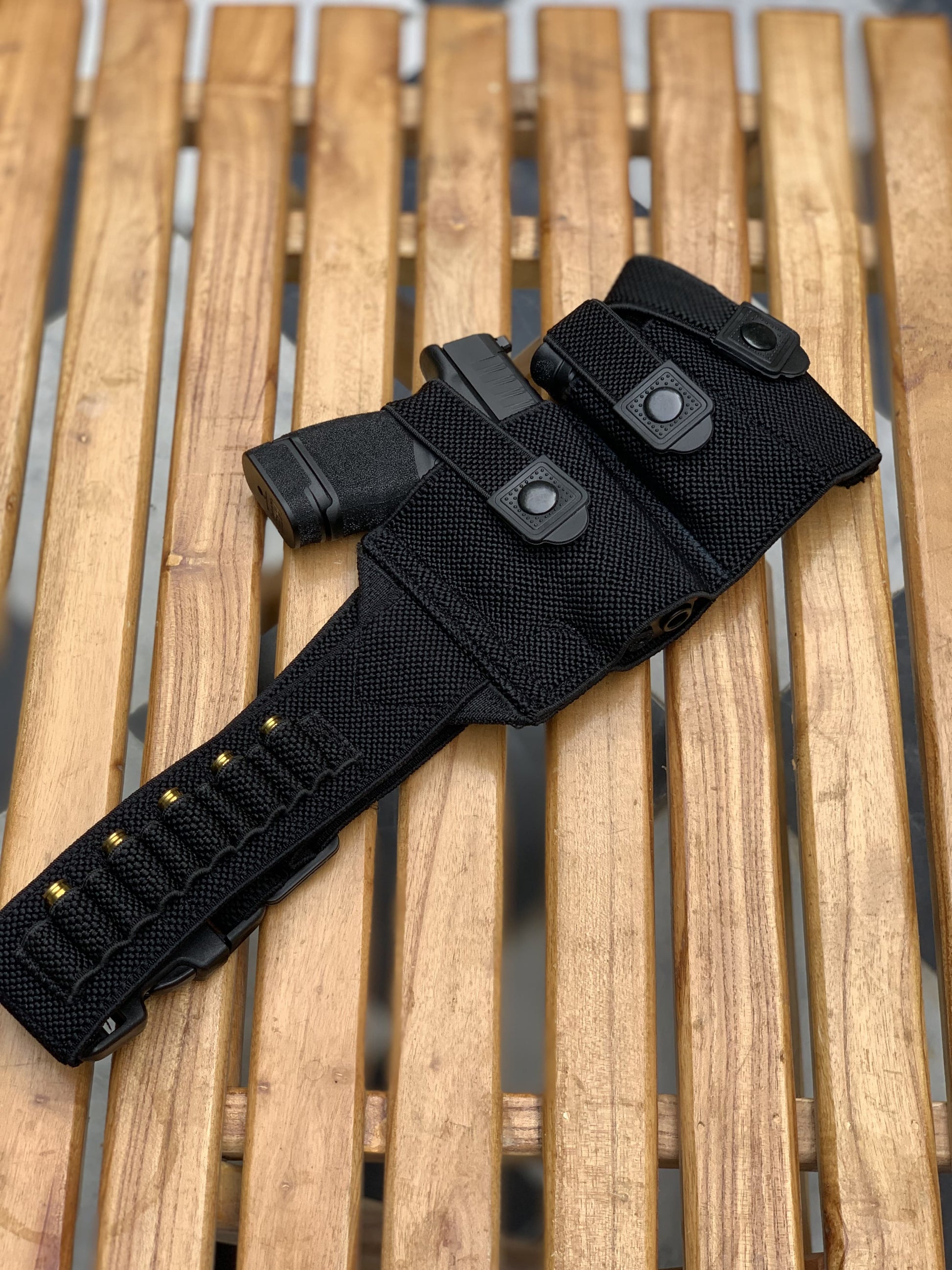 It includes Belly Elastic belt, having 10 rounds space, 1x pstl space, 2x magazines space, made of best quality , top notch lock has been used for firm grip